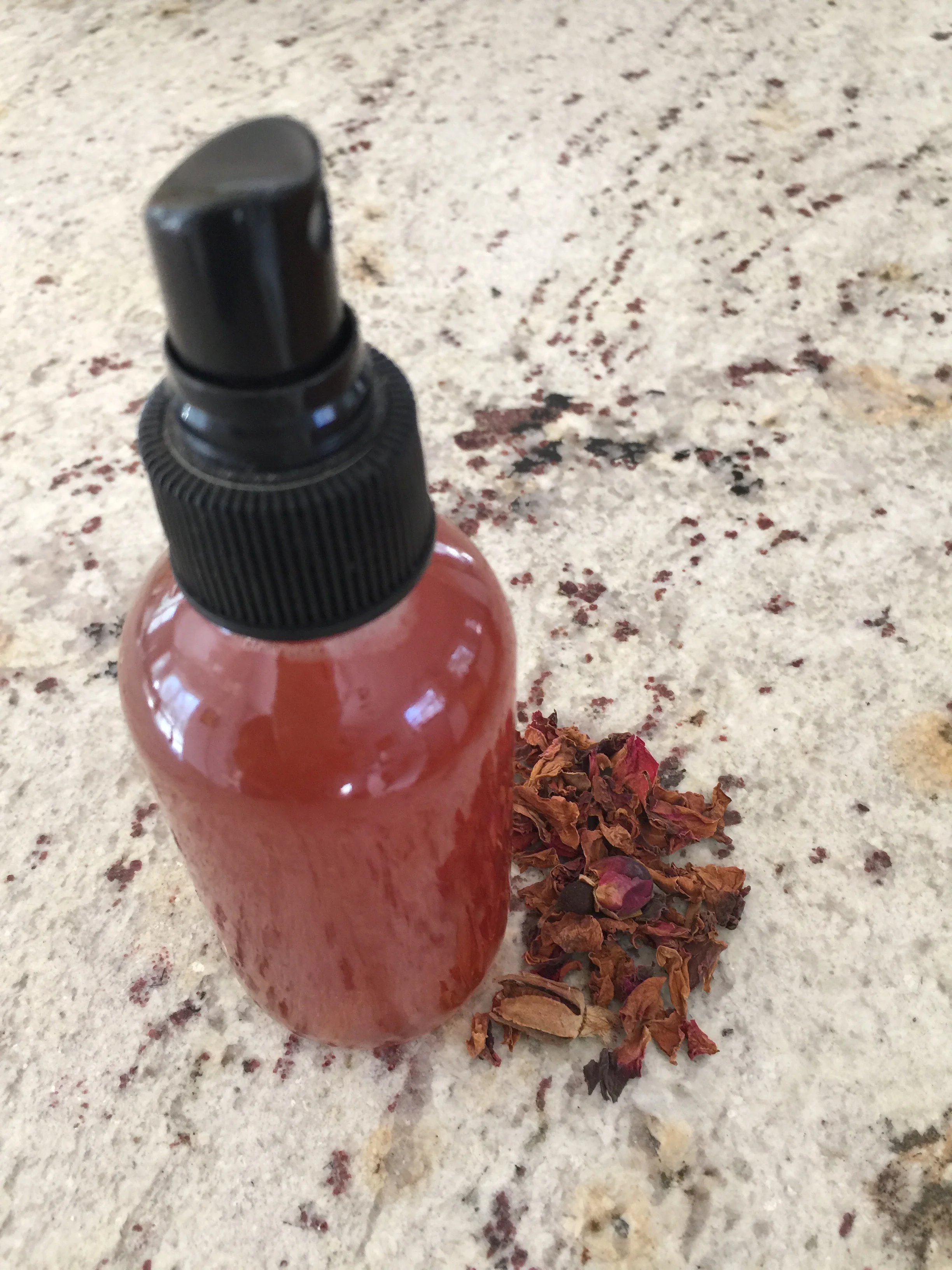 For every ounce of rose petal infused witch hazel, add four drops of rose essential oil.